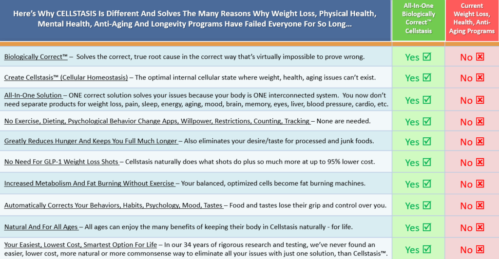 Cellstasis (short for Cellular Homeostasis) is the highest possible state of easy weight control, wellness, health (physical, mental, behavioral), anti-aging and longevity. It occurs when your cells are in optimal biological, chemical, hormonal, metabolic, immunological and electrical balance. In this optimal state your cells, organs and bodily systems operate in a balanced and nearly “frictionless” way where weight, wellness, health, aging, longevity and chronic disease issues can not exist. By FIRST reversing the deep root cellular biological imbalances that caused your issues in the first place, your issues can simply disappear. We teach you how.